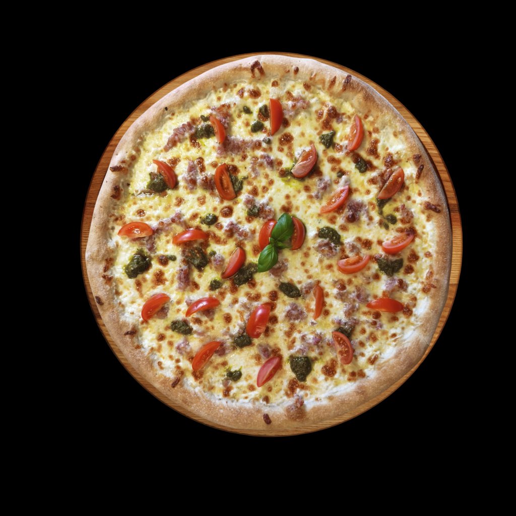 Crema,mozzarella,pancetta,cherry rajčata, bazalkové pesto